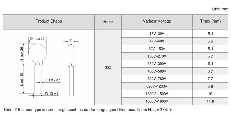 | Part No. | Varistor Voltage | Maximum Allowable Voltage | Maximum Clamping Voltage | Withstanding Surge Current | Rated Wattage | Energy | Typical Capacitance | Datasheet Download | ||