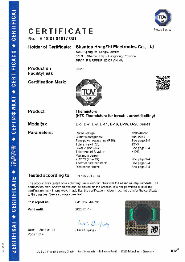 2018年1月,汕頭市鴻志電子有限公司生產(chǎn)的NTC熱敏電阻獲得德國(guó)TUV認(rèn)證;至此我司熱敏電阻共有德國(guó)TUV.美國(guó)UL.中國(guó)CQC和美國(guó)CUL四個(gè)認(rèn)證。